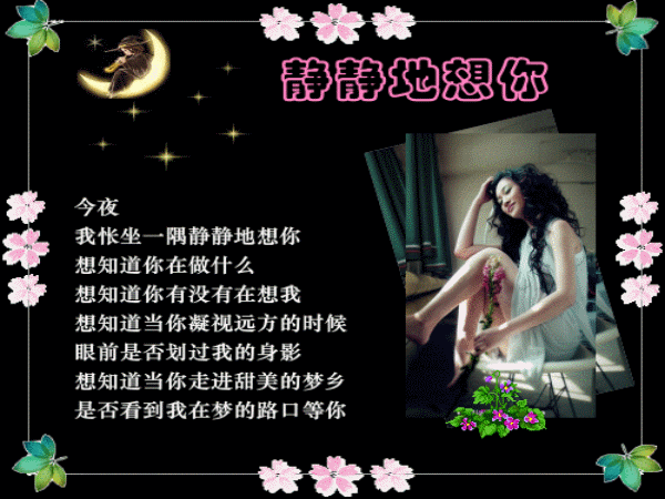 今夜,我又痴痴的在想你。 默默地站在你的窗前 带着深深的思念和柔情的爱恋 渐渐入眠........