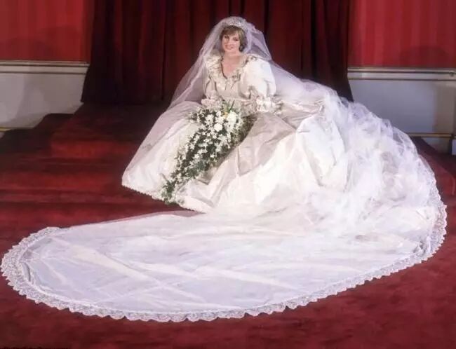 戴妃那条真丝塔釜丝绸婚纱的裙摆长达7.6米,刺绣着珍珠与母贝亮片。