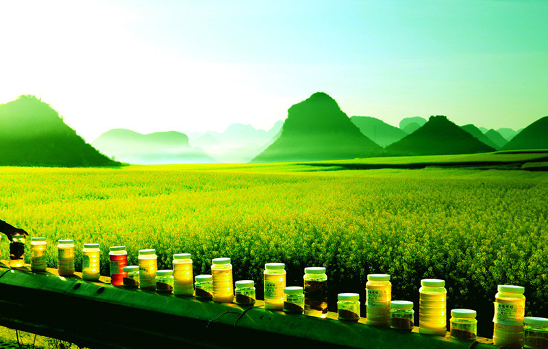 如罗平油菜花与当地喀斯特地貌结合后特别具有地方韵味,精巧玲珑的山头像油菜花海洋中浮沉的岛屿;而婺源江岭的油菜花梯田盘山而上,直上云天,富有韵律感;皖南的油菜花中间常常夹杂着具有徽派风格的民居等等;而西部油菜花田更具天高云淡的辽阔感,拍摄时利用这些内容,有助于增加画面内涵,增加可看性。此外在水乡拍摄时,还应该充分利用江河水面等丰富颜色。像浙江、安徽、江西、湖南、福建等地江水清醇且大都呈现翡翠色,绿色和黄色的油菜花结合后不但能获得较好的反差色差,而且颜色也很协调。江水作为陪衬,通过深浅不同的影调变化,烘托了前景中的油菜花。