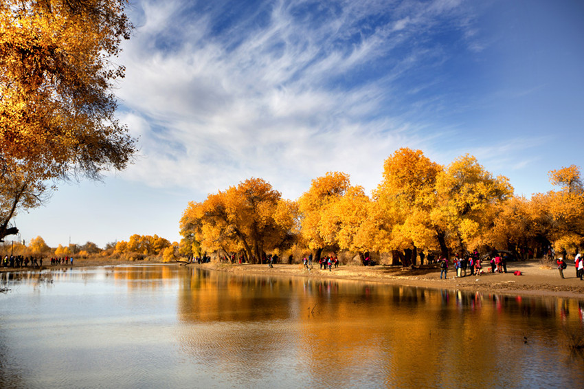 在黑水河和白水河汇聚成的额济纳河边,每隔两三千米分布着八道桥,桥边胡杨环抱,景色各异,行走其间,就象穿行于一条流光溢彩的金色海洋之中。二道桥是唯一有水相伴的胡杨林,盈盈秋水,流淌着秋天的身影和神韵,蓝天黄叶倒影在水中,亦真亦幻。在金叶铺就的林间,穿着鲜艳民族服装的姑娘小伙翩翩起舞,一匹匹高大的骆驼悠闲地踱着步子。金色的阳光透过黄叶洒落下来,染黄了眼前的一切,时间也仿佛被染成了一片金黄,秋天的色彩在这里得到了最完美的诠释。此时我已无法分得清这一切是虚幻、是梦境、是现实、是自然还是我眼中的真实。