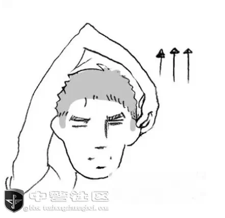 左手过头顶向上牵拉右侧耳朵数十次,然后右手牵拉左耳数十次。