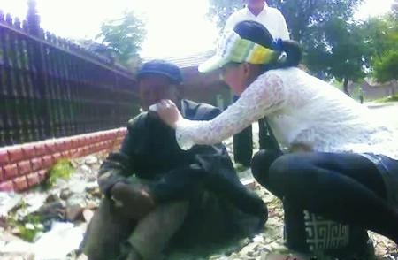 走到公司门口一个捡垃圾的老人身边,把10元钱送给了老人。
