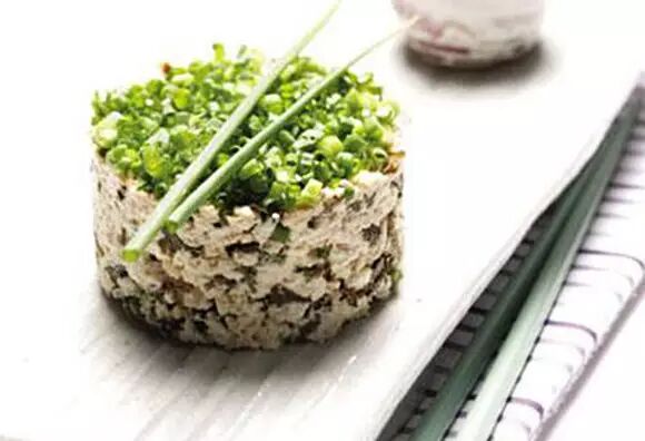 将一块豆腐洗净,鸡蛋一只打入碗加少许盐搅匀。锅内放少量食用油烧热,加豆腐用勺捣碎,边炒边煎至水分收干后,加绿茶、鸡蛋、盐、味精,边拌边淋上香油,再加葱花翻炒至熟即可出锅飨客。此菜鲜嫩可口,清淡养胃。