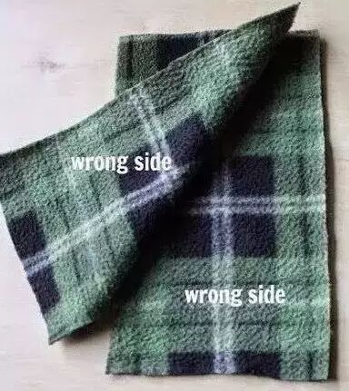 拿出其中的两块,将它们「错的那一面」对在一起叠好,什么是错的那一面呢?就是平放时边缘会往上翘的那一面。