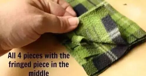 ▼接下来拿出剪刀,在最上面那块布分别剪出一公分宽的流苏型,然后翻过来做一样的动作。记得不要剪到缝线,也不要四块同时一起剪,会把一开始缝好的缝线剪坏。