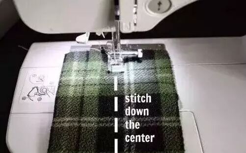 ▼将你刚刚对齐好的「错误面」拿到缝纫机下,直接从中间缝一条线即可,边缘留大概1-1.5公分的距离。