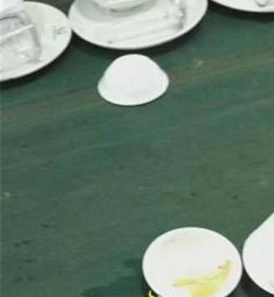 6、包装。经过消毒后的餐具被送到约2米长的绿色传送带上,工人先用手把餐具按照包装要求摆放好。之后送到包装机器,用包装膜封口包装。