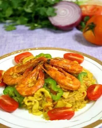 材料:大米100g、大虾6只、蟹肉棒10只、洋葱、青椒各一只、白葡萄酒、葱、咖喱粉、橄榄油、黑胡椒适量