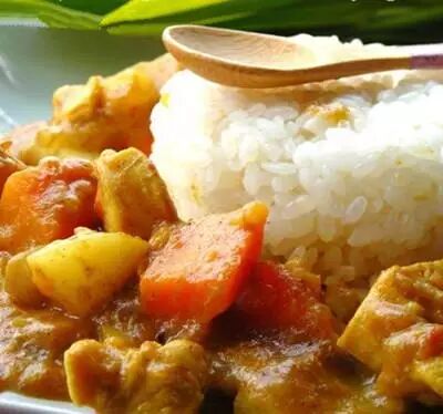 材料:米饭、鸡胸肉、土豆、胡萝卜、洋葱、苹果、香蕉、咖喱块、鸡汤宝、番茄酱、淡奶油