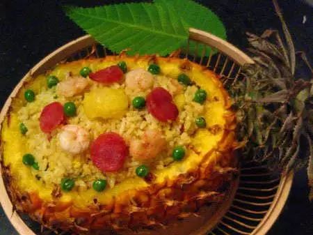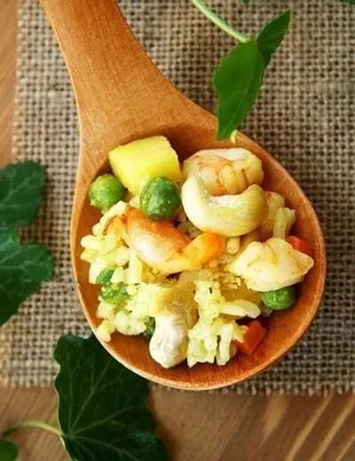 材料:鲜虾/虾仁、鸡胸肉、胡萝卜、菠萝块、腰果、米饭