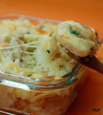 材料:米饭100g、洋葱50g、蘑菇100g、火腿/培根40g、油少量、马苏里拉奶酪适量、盐少量
