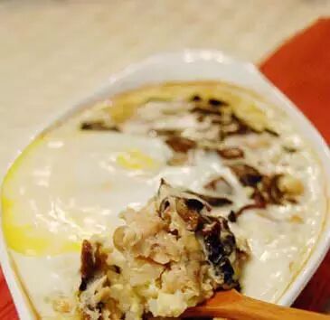 材料:鸡蛋3个、鸡肉100g、蘑菇少许、水250ml、白饭60g、蒸鱼豉油少许、盐少许、淀粉少许