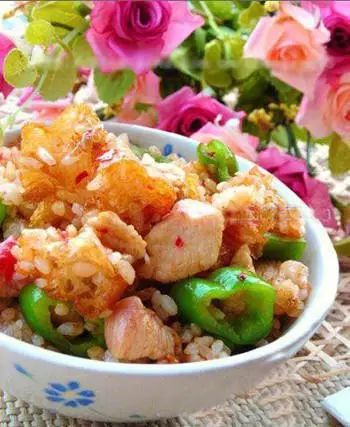 材料:米饭、鸡胸肉、油条、青椒、蒜蓉香辣酱、老抽