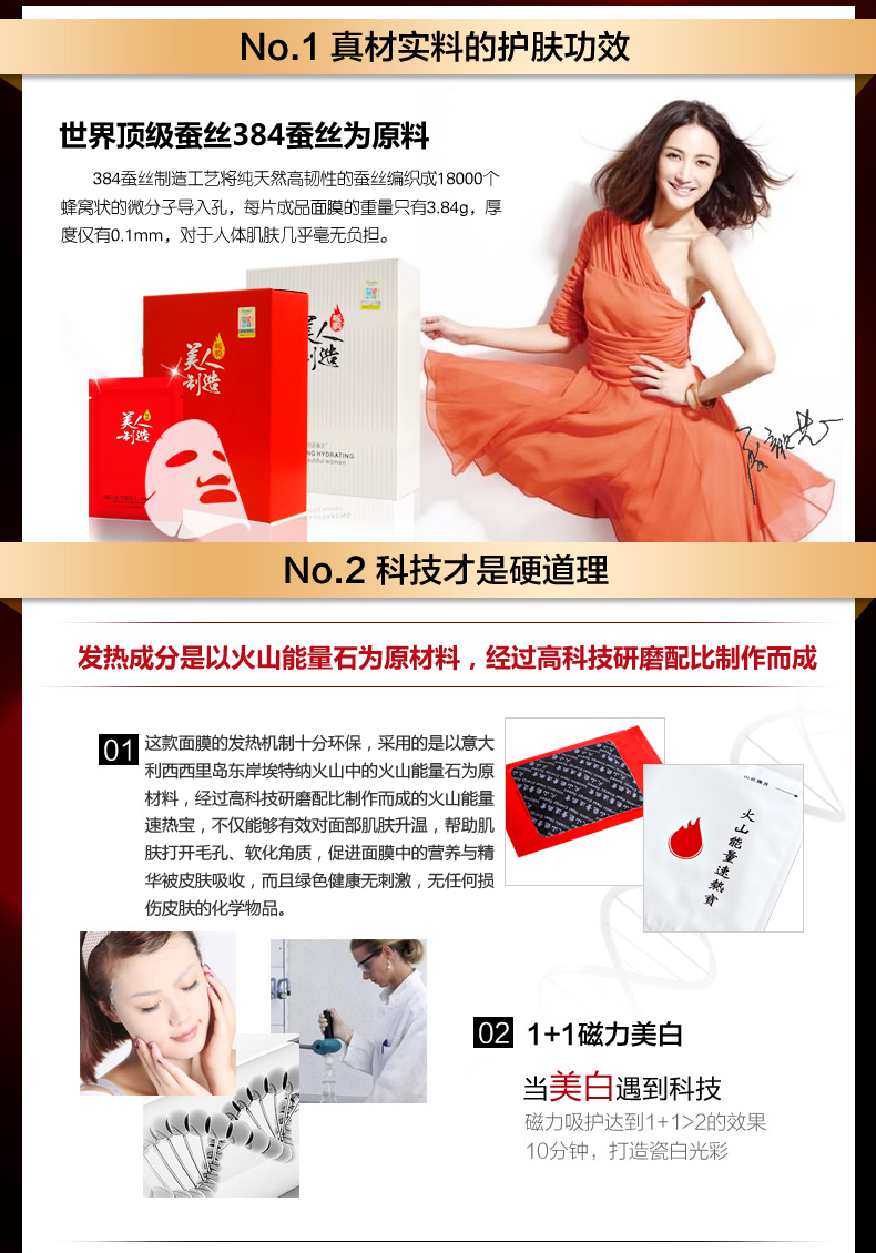 而美人制造暖膜则与之有本质的区别,采用火山能量石自发热技术,无化学物质,而且火山能量石中所蕴含的矿物元素还能将面膜精华中的精华成分分解成纳米小分子团,在加热过程中渗透到面膜精华液分子团中,并将面膜精华液中的水分子分解成小分子团水,进而帮助皮肤吸收,同时更能够形成纳米保护层,有效保护面膜精华分子不被高温所破坏,是现代高科技的完美体现。有知情人士透露,这款暖膜实际上也继承了美人制造天然蚕丝面膜的技术,从世界最顶级的蚕丝源产地采集蚕丝,并用世界顶级的384蚕丝制造工艺将纯天然高韧性的蚕丝编织成18000个蜂窝状的微分子导入孔,厚度仅有0.1mm,重量仅为3.84g,对肌肤几乎毫无负担,384蚕丝之名便是由此而来。