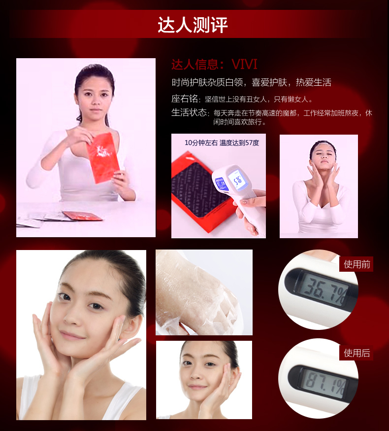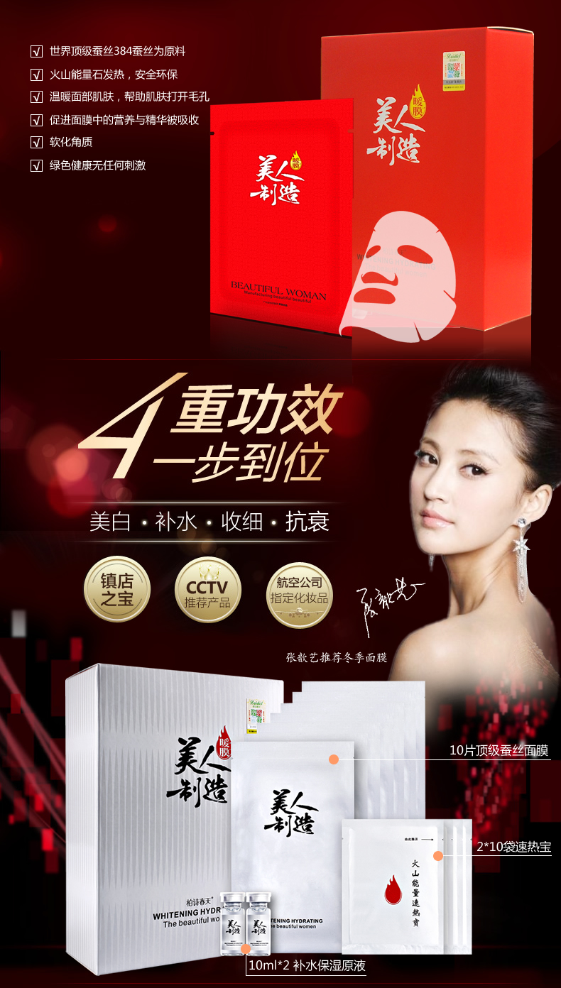 金栢丽集团继美人制造天然蚕丝面膜后推出的又一款特色产品,集美容与保健功能于一体,全方位呵护女性美丽与健康,创造性的选取采自意大利西西里岛东岸埃特纳火山中的火山能量石,通过高科技研磨配比制作而成的火山能量速热宝,能够有效对面部肌肤升温,在扩张毛孔、软化角质的同时,将面膜中的温和精华导入并激活面膜精华中的活性物成分,在不给皮肤带来任何伤害和负担的同时,使面膜中的养分被皮肤充分吸收,美容锁水效果持久。