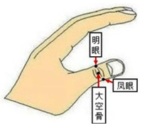在我们的姆指上有三个相邻接的穴道分别是明眼、凤眼、大空骨(如上图),明眼、凤眼能够改善眼睛疲劳和急性结膜炎,大空骨则可改善一切有关于眼睛的症状。平时眼睛容易疲劳的人,每天要刺激这三个穴道两次。