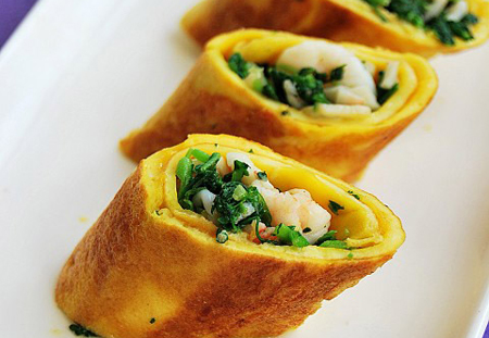 6、将“4”中的材料放在蛋皮的一端,卷成卷,最后抹上少许蛋液封口;再放进刚才摊蛋饼的锅中稍微煎一下即可。切段儿食用。
