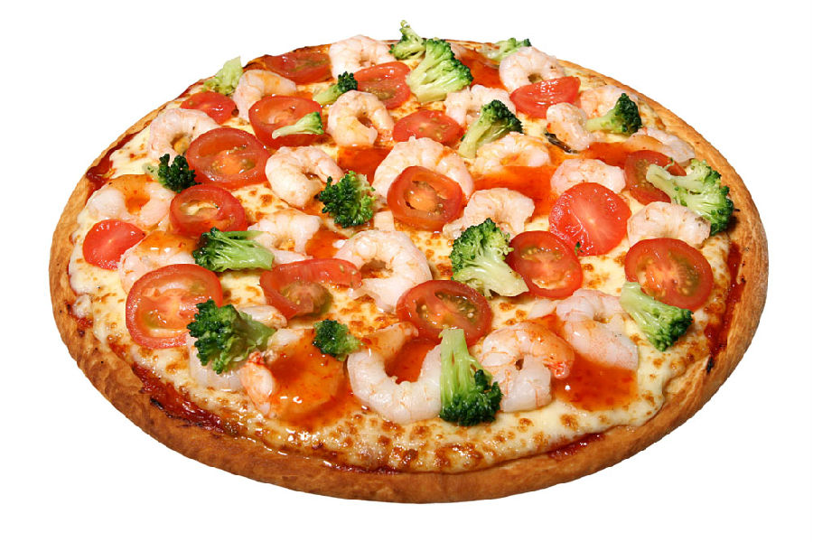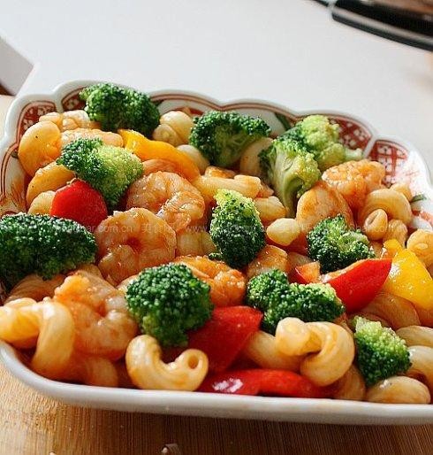 原料:彩色通心粉,虾仁,番茄泡椒罐头,西兰花,半个洋葱