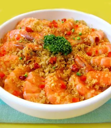 4.留少许油烧热,放入红辣椒末炒香(辣椒的量随个人喜好增减),加面包糠小火略煎至金黄色,倒入虾快速翻炒均匀即可。