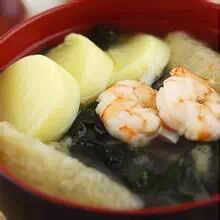 材料:味噌1小包、海带节10个、菜心6个、香菇6朵、木耳6-8朵、豆腐一块、高汤1大碗、味极鲜2大勺、香油1勺、北极虾6-8只。