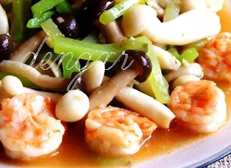 原料:蟹味菇125克、白玉菇125克、虾12只、青笋50克、大蒜2瓣。