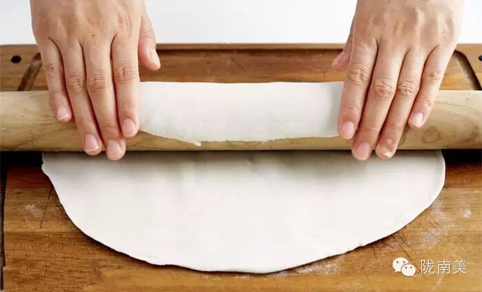在面饼表面撒些粉面,用擀面杖卷起并擀平,一边改变卷的方向,一边慢慢擀开。尽量擀成薄的大面皮,圆形最美观!