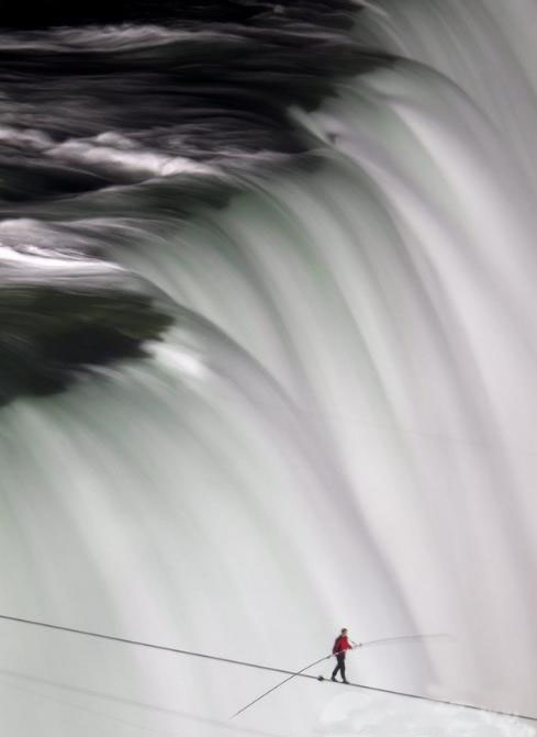 当地时间2012年6月15日,加拿大,美国著名杂技表演世家“飞人瓦伦达”家族的第七代传人尼克-瓦伦达从高空钢丝上成功跨越尼亚加拉大瀑布,成为自 1896年以来跨越大瀑布的第一人。钢丝长约550米,高出瀑布顶端约20米,行走过程持续40多分钟。