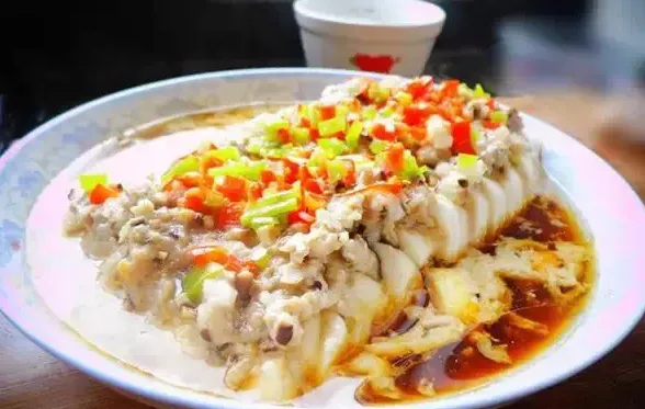 3、将鱼尾弃之不用,鱼头朝上摆在盘中,鱼片在盘中摆成扇形,做成孔雀开屏的造型,再在表面撒上姜蒜末,放入已上汽的蒸锅,蒸8-10分钟左右;
