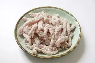 猪里脊(300克)、盐(1茶匙)、鸡精(1/2茶匙)、蛋清(1个)、二锅头(1/2汤匙)、玉米生粉(80克)