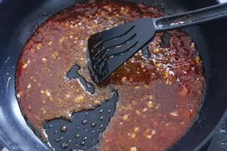 7、倒入番茄沙司和糖,用锅铲不停地搅拌。