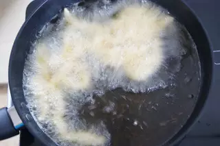 4、锅中倒入足量油,大火烧至六七成热,转中小火,逐个将肉条放入,炸至肉条浮在油面上捞出(约一分钟),炸完后将锅里的油开大火继续加热,油温八九成热时,倒入肉条复炸至金黄色。