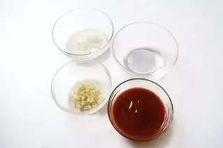 2、这时我们准备好糖醋汁材料:蒜切成蓉,番茄沙司、砂糖、白醋备好。