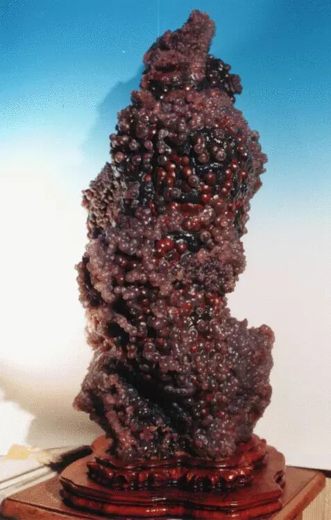 这块奇石同样是葡萄玛瑙石,中国古代有“钟馗”这个神话人物,象征了正义与神力,而这块葡萄玛瑙造型巨大,看着很像钟馗的形象,威猛神气,十分罕见,还有人管它叫“大漠霸王石”。