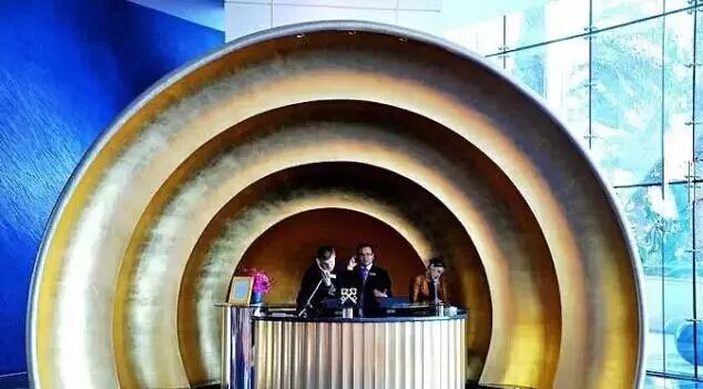 但这是黄金打造的前台啊,桌子虽小,背景却大。
