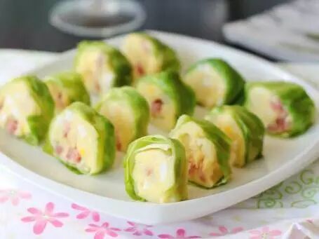 4、用手将土豆泥捏成粗条,用生菜叶将其包好。