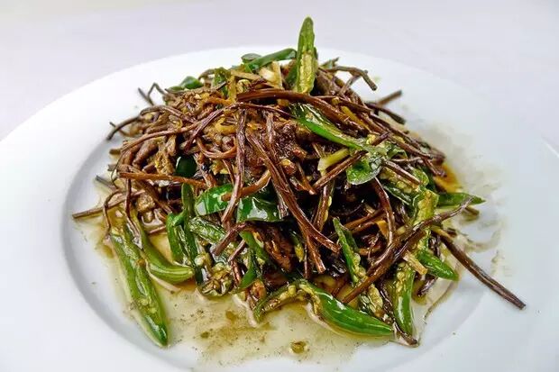 选用干茶树菇,新鲜的不行。茶树菇根部的硬头必须切掉,一根根撕开。选用小尖椒,越辣越好。