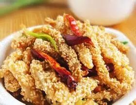3、取小点的锅入油烧五六成热,依次下入藕条炸成金黄色。将炸好的藕条沥油捞出;锅内放入少许油,小火炒香花椒和干红椒、姜片;放入藕条,再加少许盐炒匀,最后加入少量香油、花椒油翻炒片刻即可。