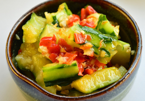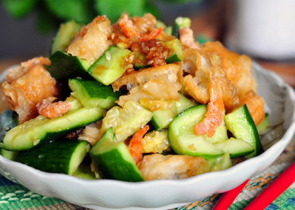 到了夏天,黄瓜便成了当家菜,新鲜水灵,顶花带刺,价格便宜,吃起来爽口清香,无论是腌黄瓜拍黄瓜还是拌黄瓜,都可以成为夏日饭桌上不可缺少的一道开胃家常,各种黄瓜的做法,让你的夏日餐桌可以变着花样吃黄瓜~ >>>>1.拍黄瓜 材料:黄瓜 1根、蒜 2瓣、食盐 1/3茶匙、白糖 1/2茶匙、米醋 1茶匙、芝麻油 少许 做法: 1、黄瓜洗净,用工具随意刮去一些皮; 2、用刀拍扁它,黄瓜脆脆的,很容易哈,不费劲,同时也将蒜粒拍碎; 3、黄瓜切成段放碗里,放入蒜、盐、白糖、米醋,2-3滴芝麻油,混合均匀,即可。 >>>>2.剁椒拌黄瓜 材料:黄瓜 1条、蒜 3瓣、剁椒酱 2汤匙、生抽 1/2汤匙、醋 1汤匙、葱白 2克、植物油 适量 做法: 1、材料准备好,蒜头切末,黄瓜拍碎(记得是拍碎哦,不要切,拍的容易入味些); 2、将剁椒酱、生抽、醋和白糖倒入黄瓜碗里,拌匀,锅里烧热油,爆香蒜; 3、酱爆好的蒜蓉油倒入黄瓜碗里,拌匀即可。 >>>>3.五味黄瓜条 材料:黄瓜 2根、干辣椒 6克、花椒 1小把、食盐 3克、白糖 2克、生抽 5克、香醋 5克、植物油 少许 做法: 1、黄瓜洗净,切条,用盐拌匀,腌制半小时,控干杀出的水分; 2、添加糖、生抽和香醋拌匀,花椒粒洗净晾干,干辣椒切丝; 3、起油锅,小火炸香花椒和干辣椒,趁热浇在拌好的黄瓜条上,吃时拌匀。 >>>>4.黄瓜拌油条 材料:油条 1根、乳黄瓜 2根、虾米 1小把、蒜 3瓣、酱油 3小勺、陈醋 2小勺、香油 1小勺、白糖 少许 做法: 1、油条撕成方便入口的小块儿,放进沙拉碗; 2、小黄瓜洗净,拍松,切成块儿; 3、黄瓜与油条混合; 4、大蒜压成泥,加入酱油、陈醋、香油和少许白糖,拌成蒜汁; 5、将蒜汁加入油条和黄瓜中,拌匀; 6、撒上几粒海米,装盘上桌即可。 >>>>5.黄瓜拌木耳 材料:黑木耳 30克、黄瓜 1根、红尖椒 1/2个、蒜 2瓣、姜 2片、食盐 1/2茶匙、生抽 1/2汤匙、香醋 1/2汤匙、香油 1/2茶匙、橄榄油 1/2汤匙、白糖 1/2茶匙、鸡精 1/4茶匙 做法: 1、黑木耳用冷水浸泡2个小时左右至其泡发; 2、然后用手撕成小块; 3、烧开水,将木耳放入焯烫至水再次烧开,盛出过凉开水沥干待用; 4、红尖椒切颗粒,姜和蒜剁成末; 5、黄瓜表皮洗净削花刀皮,都去皮也可以的,我这样是为了养眼,然后切小块; 6、将所有材料放入碗中; 7、加入调料拌匀,装盘即可。 >>>>6.黄瓜拌粉丝 材料:粉丝2小捆、黄瓜 1根、姜 2片、蒜 2瓣、酱油 1勺、白醋 1勺、香油 1勺、花椒油 1勺、辣椒油 1勺、白糖 1勺 做法: 1、干粉丝提前用清水泡发,洗净备用; 2、黄瓜洗净后,刨成细丝备用; 3、煮锅里倒入清水烧开,将粉丝放入锅里煮熟; 4、煮好的粉丝捞出,过凉白开; 5、姜、蒜洗净后,切末,切好的姜蒜,调入适量凉白开,浸泡几分钟; 6、再调入适量酱油、白醋、香油、花椒油、熟油辣子、糖,搅拌均匀; 7、粉丝沥干水分后,拌入黄瓜丝; 8、将调料淋入粉丝里,搅拌均匀。
