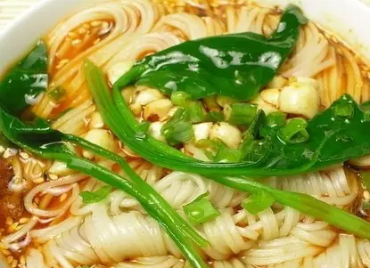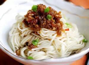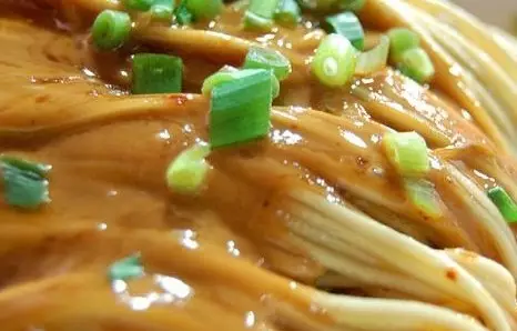 材料: 切面150克,麻酱一大匙,葱花一中匙,精盐半小匙,味精半小匙,熟色拉油一中匙,沸水500克。
