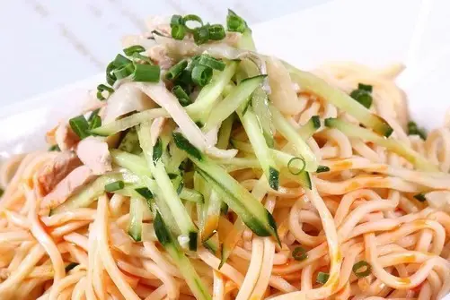材料: 白斩鸡数块、面条、黄瓜、芝麻酱、麻油、糖各1大匙、酱油2大匙、辣椒粉适量