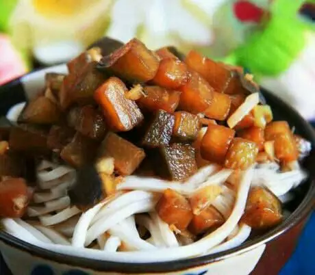 7、将煮好的面条沥干水分,放放入碗内,然后浇上炒好的杂酱。搅拌均匀即可食用。