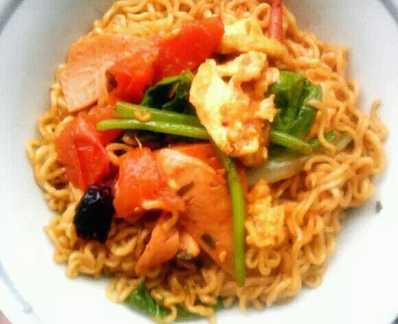 4、然后加水煮入味(水可以比做汤的时候稍多一些)。大概可以煮上五分钟吧,然后盛出倒在面碗里,加盐(盐要多一些),味精,香油。