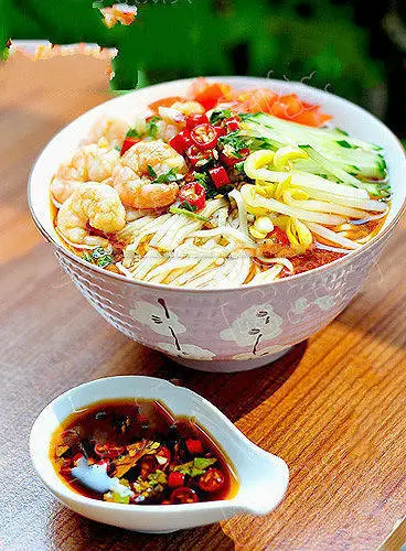 6、将面条放入碗内,表面码上熟虾仁,黄瓜丝等,再淋上凉面酱汁即可食用。