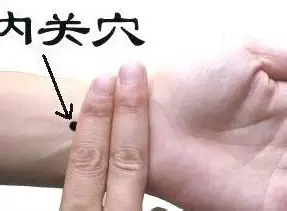 内关穴位于手腕内侧距手掌约6-7厘米处见下图,用拇指按压内关穴数分钟至有酸胀感即可消除打嗝。