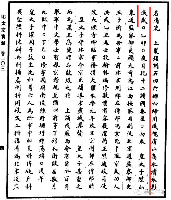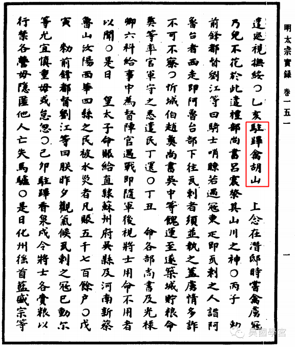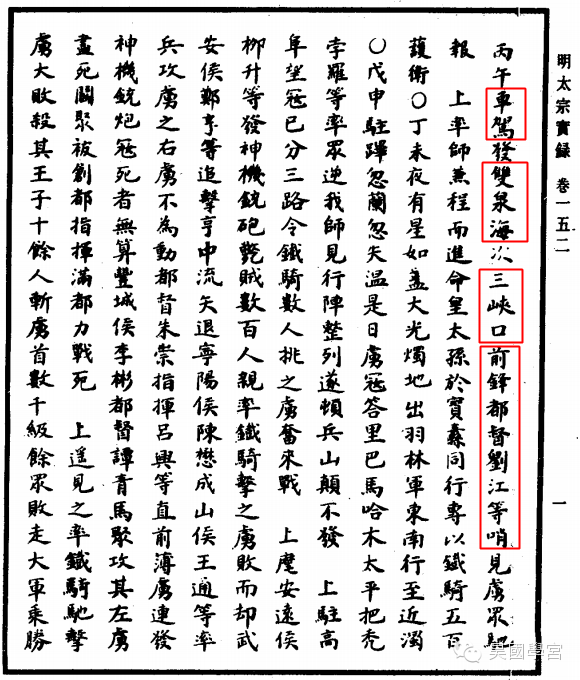 ○丙午车驾发双泉海次三峡口前锋都督刘江等哨见虏众驰报 上率师兼程而进命皇太孙于宝纛同行专以铁骑五百护卫