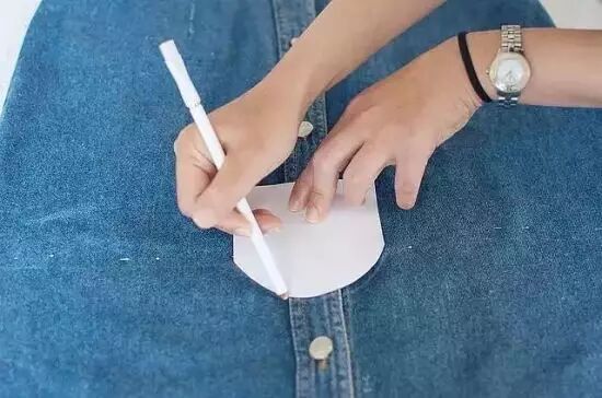 ❶将卡片剪成250px宽半圆的边,牛仔半身裙的中部沿着弧度画出花边的轮廓。