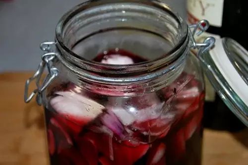 将洋葱装入玻璃瓶内,加入红葡萄酒,(将剥下来的外皮也一起加入效果更好)。