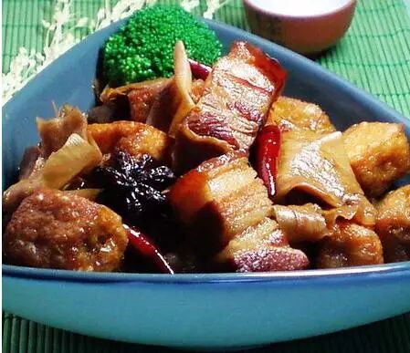 原料:五花肉500克,板栗20克,姜适量,老抽2汤匙,料酒1汤匙,食盐少许,冰糖10克,小葱1根。