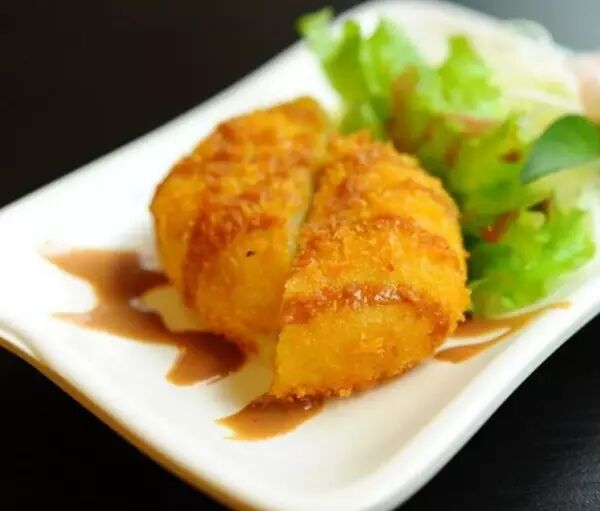 7.将土豆饼放在小麦粉上滚一滚,使之沾满面粉,接着,在鸡蛋中过一下,然后均匀地抹上面包粉