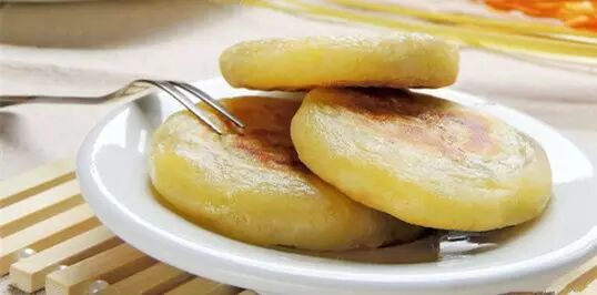 2.这土豆饼是软糯的,煎的时候一定要一面定型后再反转,反转的时候用筷子加铲子一起,小心的慢慢翻转,两面都煎至定型后翻面就很容易了。